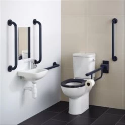 Doc M Contour 21+ close coupled left hand corner pack, WC pan, water saving delay fill cistern with spatula lever, basin, grab rails, hinged support rail with toilet roll holder, seat no cover with retaining buffers, copper tails on TMV3 mixer tap