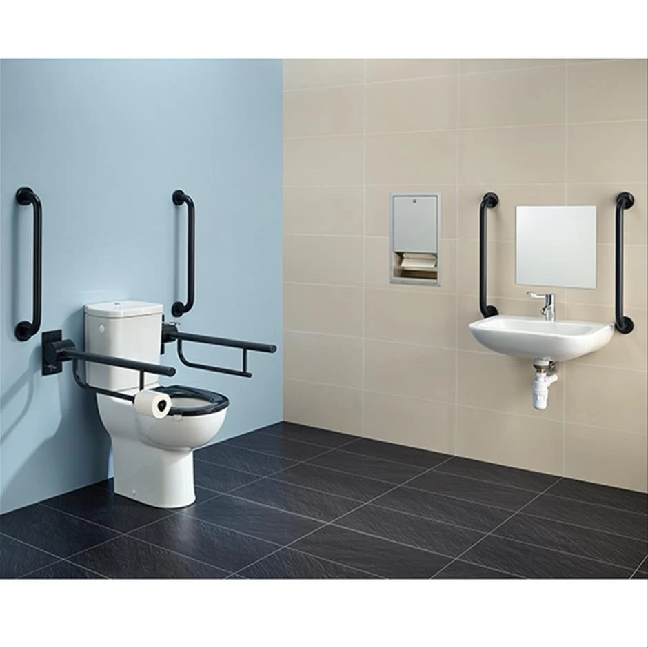Close coupled WC pan, water saving delay fill cistern with spatula lever, grab rails, 2 hinged arm support, toilet roll holder, seat no cover with retaining buffers, larger washbasin, copper tails on TMV3 mixer tap