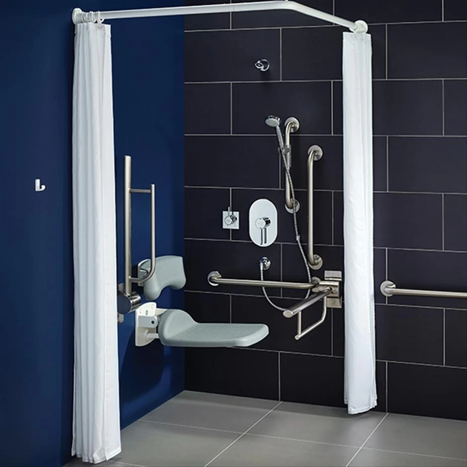 Shower room pack with folding shower seat and back support in grey, 3 x 60cm grab rails, 2 x hinged rails and 2 x 45cm grab rails, lever operated thermostatic mixer for concealed supplies, shower handset holder, handset & hose, fixed short projection shower head, lever operated diverter, shower curtain and shower rail