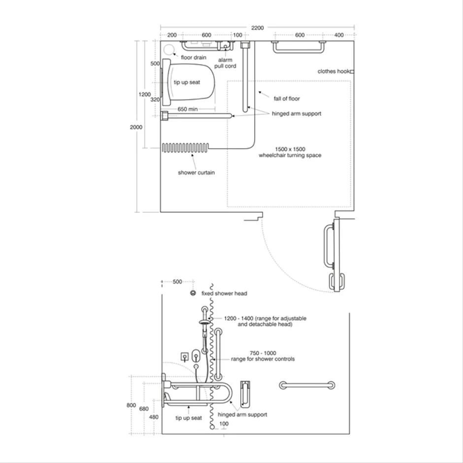 Fixing heights: Floor to top of shower seat 480mm. Floor to centre of back rest of rail 800mm. Floor to centre of horizontal grab rail 800mm