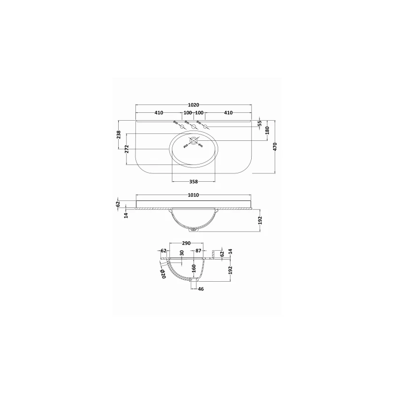1000mm Single Bowl 3 Tap Hole Curved Marble Top