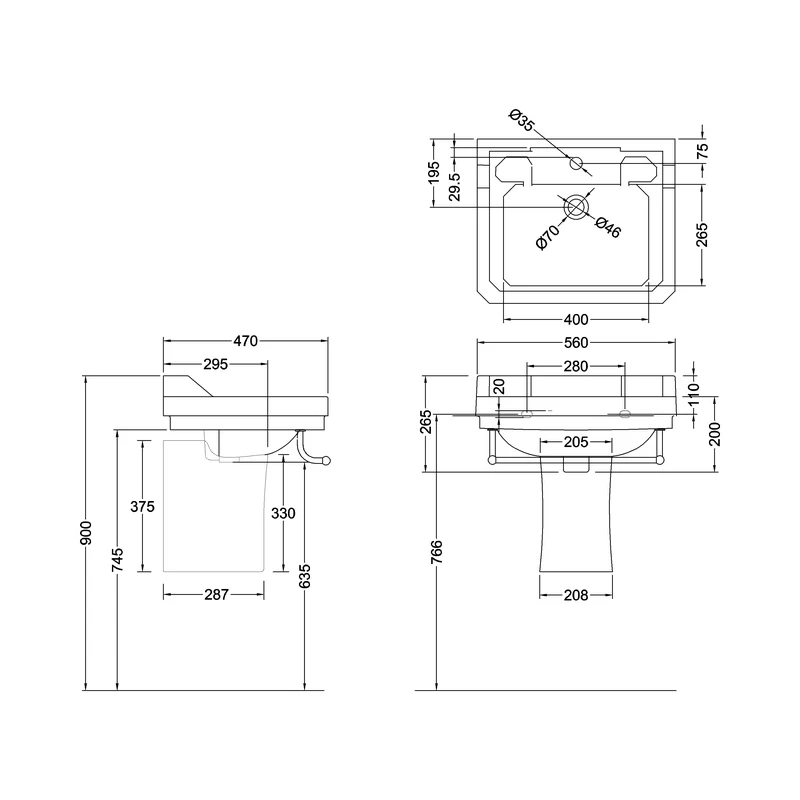 Consists of 1 x 56cm towel rail chrome (T1 CHR), 1 x Semi Pedestal (including wall fixings) (P8) and 1 x Edwardian basin 56cm 2 tap holes (B4 2TH)