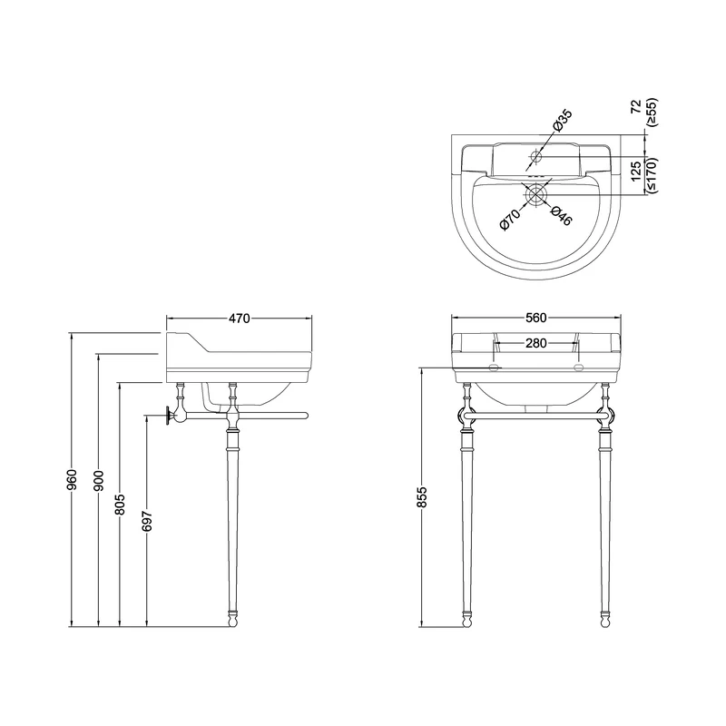 Consists of 1 x Edwardian round basin 56cm 1 tap hole (B6 1TH), 1 x 56cm Round Basin Wash Stand Chrome (T24A CHR) and 1 x Regal basin stand extension kit (T62)