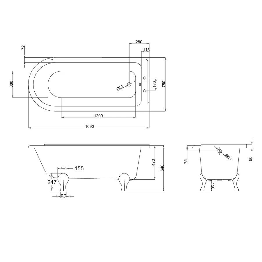 Hampton 170cm Right Handed Showering Bath with Chrome Luxury Feet (Set of 4)