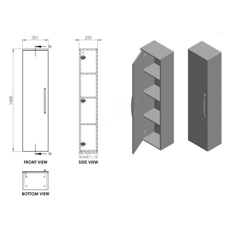 350mm Width x 1400mm Height x 250mm Depth