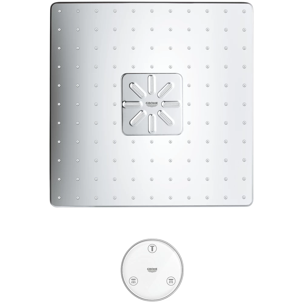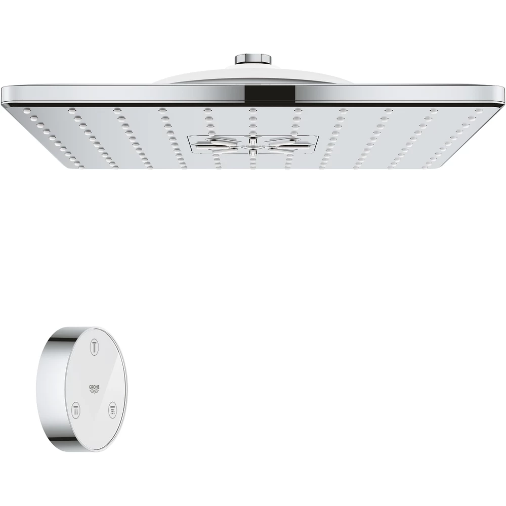 Grohe Rainshower 310 SmartConnect Cube head shower with remote control. The head shower has two different spray patterns – the gentle, relaxing Grohe PureRain spray and the invigorating Grohe ActiveRain, strong enough for rinsing out shampoo and targeted enough to offer a stimulating head, neck and back massage. These spray patterns can be used individually, or combined. Thanks to the shower?s innovative remote control, you can switch between the sprays without having to reach up to the shower head, increasing the comfort of your experience. The remote control has up to four-years of battery life, and can be placed in any position. With no mains connection or additional boxes required, this shower is ideal for retro-fitting. The shower head can be mounted on your existing shower arm or system. It features Grohe DreamSpray technology that ensures and even flow from every nozzle, and the SpeedClean features lets you brush the nozzles free of limescale with just your finger. For a water-saving option, Grohe EcoJoy limits flow to 9.5 litre/minute with the same great performance. The Grohe StarLight chrome finish is durable as well as dazzling, while the super-insulated Inner WaterGuide channels hot water away from surfaces, not only making the shower touch-safe, but also giving greater longevity to the shower’s finish.