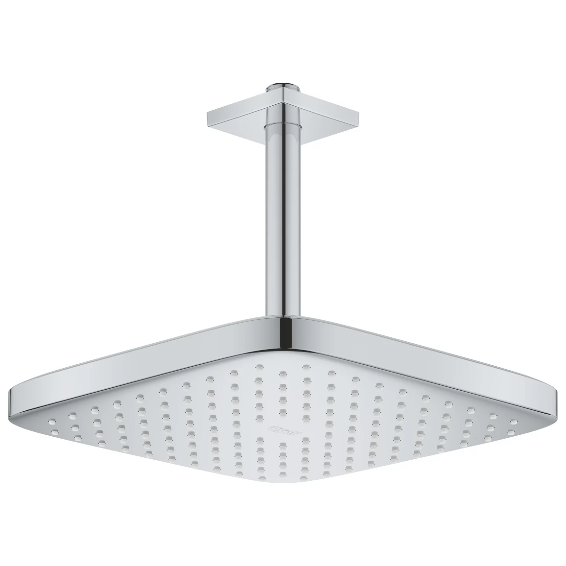 This ceiling-mounted soft square head shower has a wide 250mm face, and a 142mm shower arm with square escutcheon, providing lots of space to spread out. It comes with the gentle, refreshing rain spray pattern, enhanced by Grohe DreamSpray, which keeps the flow from every nozzle equal and consistent, for a more enjoyable experience. Grohe EcoJoy limits the water flow to 9.5 litre/minute but still delivers pure and satisfying indulgence. SpeedClean nozzles on the shower head can be brushed clean of limescale with a finger for easy maintenance. Inside, an insulated inner waterguide keeps the surface from becoming too hot, protecting the dazzling but durable Grohe StarLight chrome finish.