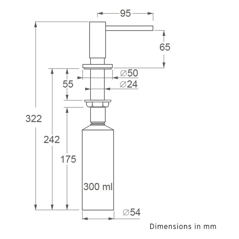 Installation requires 242mm beneath the surface for the 300ml soap tank