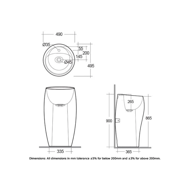 Width 490mm, Depth 495mm, Height 900mm
