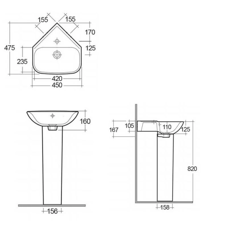 RAK Origin 62 450mm 1 Tap Hole Corner Basin and Full Pedestal Pack