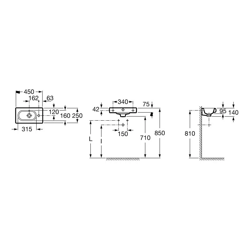 Meridian-N Compact Wall-hung cloakroom basin 450 x 250mm 1 Right Hand taphole